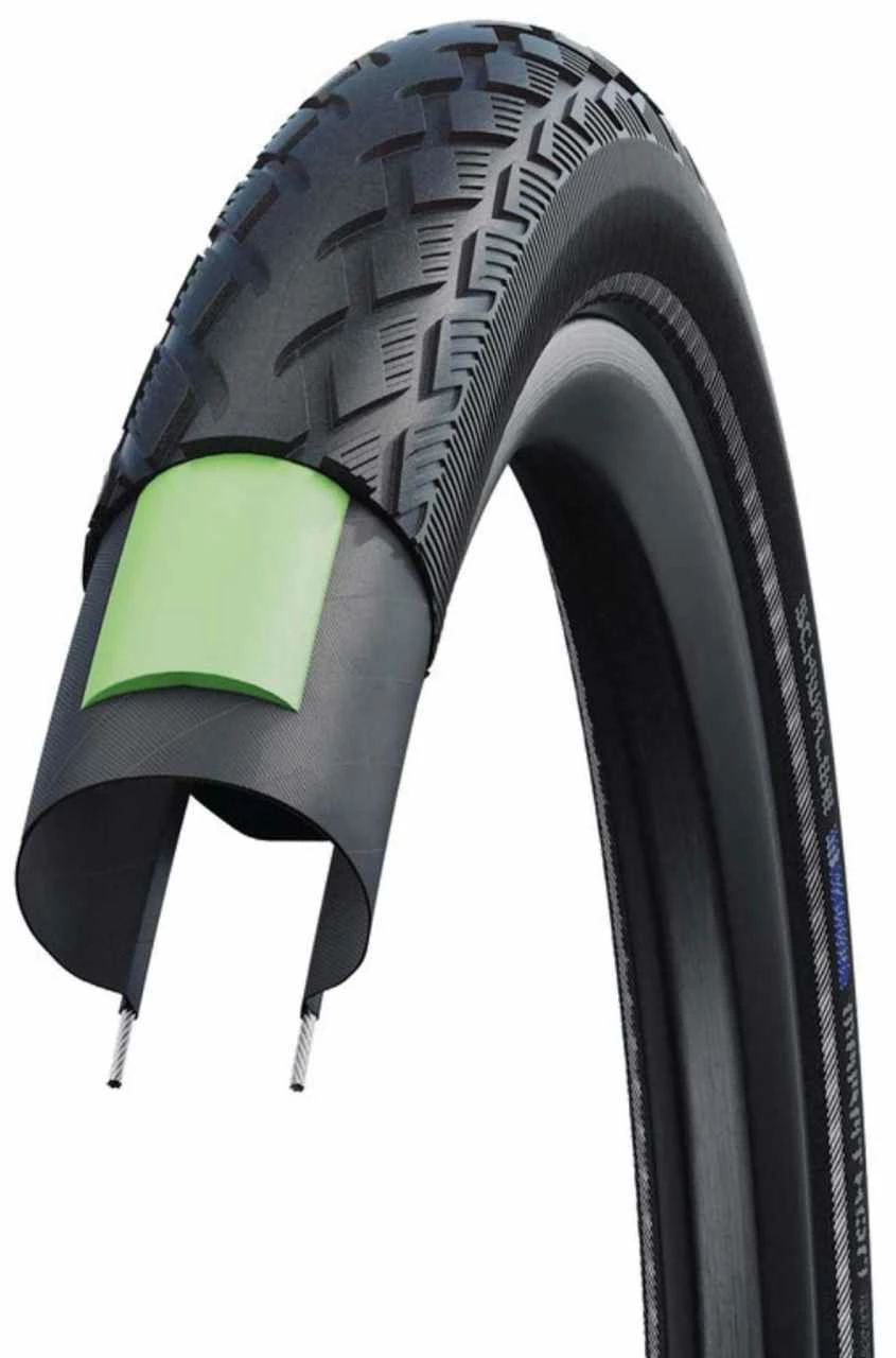 Le pneu original. L’ancĂŞtre de tous les pneus de randonnĂ©e de haute qualitĂ©. L’insert GreenGuard en caoutchouc naturel hautement Ă©lastique a une Ă©paisseur de 3 mm. Un tiers du GreenGuard est fabriquĂ© Ă partir de produits en latex recyclĂ©s. Le flanc anti-vieillissement supporte les surcharges typiques dues Ă une pression d’air trop faible beaucoup plus longtemps avant de se fissurer de manière disgracieuse.
